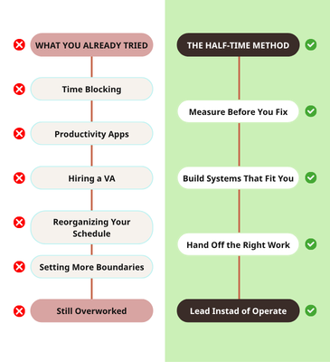 We built The Half-Time Method to fix that. And this workshop is where it starts -- with one hour of honest math that shows you more about your business than any productivity tool ever has.